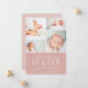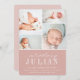 Elegant birth announcements feature four newborn photos arranged in a grid collage layout on a dusty blush pink background. "Introducing [name]" appears beneath in chic calligraphy script and classic block lettering. Personalise with baby's full name, birth stats, and a family signature at the bottom.