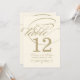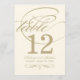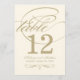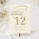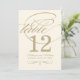 Rich gold calligraphy and delicate ornamental flourishes on a soft ivory background create a refined, formal wedding table number card. The warm metallic tones and sweeping script bring an air of luxury to your reception tables. The couple's names, wedding date, and table number are easy to personalise. Each table number must be individually personalised and added to the cart one at a time.