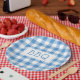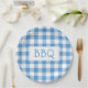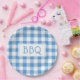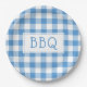 Get ready for your summer barbecue party with paper plates featuring light blue, white, and baby blue squares in a classic buffalo plaid with the letters BBQ in a white rectangle in the centre.