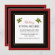 A beautifully classic corporate holiday open house invitation with elegant colour block style in red and black with a thin gold border surrounding your text. A pair of green and red holly sprigs add seasonal appeal to the clean modern text layout. Personalise with your event details.