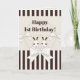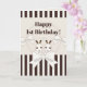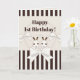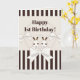 The product design features bunny twins and off-white ribbons. This adorable animal cartoon with stripes makes a cute, classic modern, and unique kids birthday card with personalised text for girls - Happy 1st Birthday.