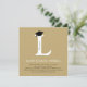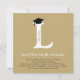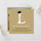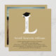 This classic and simple gold and white graduation party invitation card design features a bold monogram letter 'L' of the graduate with a mortar board / graduation cap as an accent.