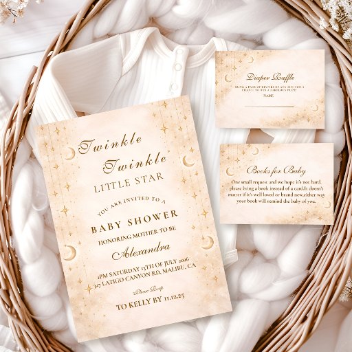 A dreamy celestial design inspired by soft starlit skies and golden moonlight. Delicate crescent moons and scattered stars frame a warm ivory background, while refined gold typography creates an elegant, timeless feel. Perfect for a classic, gender-neutral celebration with a touch of sophistication. Ideal for mamas who love soft neutrals, subtle sparkle, and a graceful, storybook atmosphere.