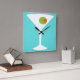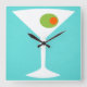 This Classic Movie Martini Wall Clock features a turquoise background and the white silhouette of a martini glass. Inside the glass is a glorious green olive with an orange pimento. This is a fun wall clock for everyone who wishes they were a character in a classic movie. Shaken not stirred, please!