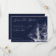 Impress your guests with this classic wedding save the date card. This classic card features a vintage illustration of a frigate sailing ship, which you can replace with an image of the destination where you will be married (transparent background preferred). Elegant white lettering on a dark blue background displays the bride and groom names, and details of the wedding, including the location, date and that a formal invitation will follow.