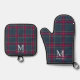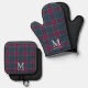 Personalized oven mitts and pot holders for the holiday season featuring classic style navy blue and red Christmas plaid pattern with custom initial and name.
