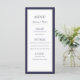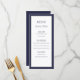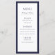 Classic navy blue menu card with block and script text within a navy blue and grey border. Navy blue back. To adjust the layout to fit your specific menu, click Customise It, Edit Text, then click and drag text sections to desired locations. Use cntrl to select and move multiple sections at once.