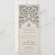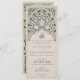 Exemplifying timeless elegance, this wedding invitation is a nod to the exquisite art of Islamic lacework. Set against a deep navy blue background, the intricate cream lace pattern evokes the sophistication of traditional Islamic filigree. This striking contrast is softened by the warm cream tones, creating a sense of depth and texture that resembles handcrafted artisanal paper. The front features a beautifully detailed, arch-shaped design that would leave a lasting impression, while the back offers a clean canvas for the wedding details. Ideal for couples who appreciate the blend of classic style and cultural artistry in their wedding stationery.