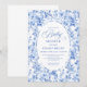 Create a timeless first impression with this baby shower invitation featuring elegant French toile de jouy roses in refined shades of navy blue, royal blue, dusty blue, and deep blue, inspired by classic chinoiserie floral design. This sophisticated style blends heritage elegance with modern charm, making it perfect for a memorable baby shower celebration.