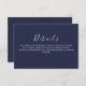 This classic wedding details card features a rich navy blue background and elegant script font, perfect for including important guest information such as your wedding website, RSVP instructions, accommodations, directions, or reception details. The minimalist design pairs seamlessly with a wide range of wedding invitations, especially formal or navy and gold-themed suites. Easily customise with your unique message to guide guests with style and clarity.