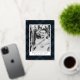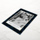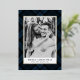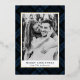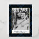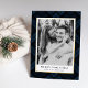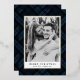 Elegant holiday photo card featuring your vertical photo framed in gold foil with a navy tartan plaid background. Personalise the front of the navy tartan Christmas photo card with your greeting and name.
