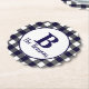 Classic Navy White Monogram Buffalo Plaid Paper Coaster
