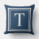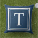 A classic outdoor pillow featuring a bold white monogram initial inside a square frame border on a deep navy background. The timeless serif letter and clean geometric frame create a nautical, preppy accent for patio furniture, deck seating, or porch chairs. The initial is fully customisable.