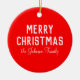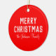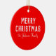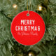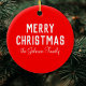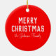 A classic Christmas ornament with a vibrant red colour. Featuring bold, modern white text that reads "Merry Christmas," alongside a personalised handwritten name or surname of the recipient, making it a thoughtful and unique touch for holiday gifting.