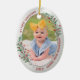 The ornament in oval shape has a classic silver frame adorned with Christmas plants and ribbon to display your own special memory of your new baby. The bright and shiny silver border encircles your photos. The holly, greenery and silk ribbon complete the whole design with a joyful atmosphere of the holiday season. On the back side, the heartwarming quote on the edge of the frame, "Peace, joy and love, now and always!" expresses your deep love and wishes for your precious little one. Easily place your own memorable photo in place of the template photo as well as the name and year to make your own ones, and send it to your family and friends to celebrate the baby's first Christmas!