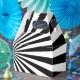 A vibrant bold colourful sun burst style graphic decor on a custom favour box.