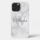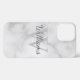 features personalised name in grey script font style and monogram in light grey serif font style as background, on white marble look background.