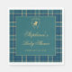 A preppy, classic personalised baby shower napkins with equestrian and plaid elements in navy and hunter green with gold tone accents. A family name crest with monogram and a polo player silhouette with horse adorns the top and the tartan pattern adds a timeless touch. Perfect for an Old Money themed baby shower with a classic, vintage and luxurious feel. If you like grandpa core, vintage style this is a great baby shower theme. Customise this editable baby shower napkins template with your own event details.