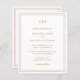 Classic style earth tone all in one budget wedding invitation in a terracotta / rust / orange colour featuring a simple and minimal design with your monogram at the top and your event details surrounded by a double border. The fonts alternate between and elegant script, a traditional serif and minimalist sans serif fonts. The back has your guest details along with an optional QR Code (if you prefer, you may remove the QR Code in the design editing tool). This invitation is great for a formal wedding.