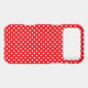 White polka dots on a red background.