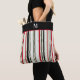 Here's a classic red, black, white, and tan varied stripe pattern that makes a great looking tote bag! A wide top border of black holds your simple one letter monogram in white. The black border is separated from the stripe section by a thin red line. Both sides have the same design. A very professional and tailored look.*Clip art used in this design is copyrighted by Encore Software, Inc., which permits use to its licensors. All rights reserved.