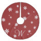This tree skirt is accented with your family monogram on a classic red background covered in snowflakes.