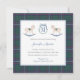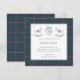 A timeless baby shower invitation for a mom who values tradition and heritage. This winter-theme baby shower invite card design features a simple monogram crest with ribbon bow trim flanked on either side by a wooden rocking horse. All watercolor elements were painted by me onto 100% cotton paper and scanned into digital form. The border and reverse feature a classic blue green and red tartan pattern, created digitally by me.