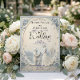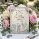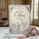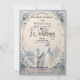 Set a sophisticated tone with this dusty blue and cream design, featuring a printed faux bas-relief proposal scene perfect for a springtime celebration.This elegant composition utilises a formal typographical hierarchy, balancing classic serif fonts in dark navy with flowing calligraphy script. The central illustration showcases a highly detailed, faux 3D sculpted aesthetic depicting a classic garden environment. Visual elements include an off-white and cream background framing a cobblestone path, a traditional pavilion building, and a kneeling groom proposing to a bride in a flowing dress. The perimeter is softened by an oval botanical border of dusty blue blossoms, soft grey-blue greenery, and scattered flower petals.This is a flat printed image with a faux bas-relief effect, not actual raised material.