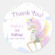 Birthday Classic Round Sticker with an adorable unicorn with wings, which is surrounded by cute pictures of a magical castle, clouds and festive bunting.