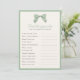 Editable game title and text questions for baby shower or bridal shower. Features a hand painted bow with subtle plaid in Sage Green and ivory background; editable border and background colour on front and back.