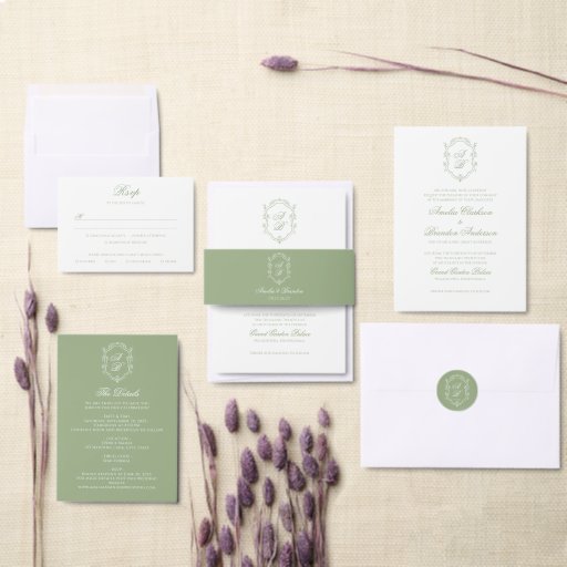Classic Sage Green Floral Monogram Crest Wedding Invitation
