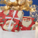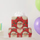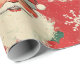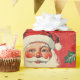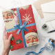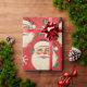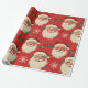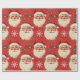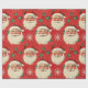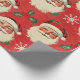 This vintage-style wrapping paper features a repeating pattern of classic Santa Claus faces. Each Santa sports a red hat and a full white beard, with rosy cheeks and a jolly expression. Interspersed among the Santas are sprigs of green pine, adding a touch of festive greenery to the design. The background has a red, textured, slightly aged appearance, giving it a nostalgic feel.