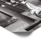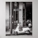 This is a classic vintage poster of a Vintage Italian scooter in France, a classic black and white scooter, an Italian retro design. The scooter is photographed in Paris, France