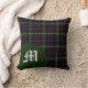 Stylish plaid pillow done in the traditional colourful Malcolm family tartan plaid pattern. A green circular area, in the bottom left front, has a light grey one letter monogram ready to personalise with your family initial. Handsome accent throw pillow with a classic pattern and monogram.