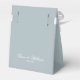 Classic light dusty blue wedding Thank You favour box. Thank You with bride and groom names and date in elegant script text.