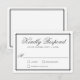 Timeless and elegant, this tasteful wedding RSVP card design features the classic colour palette of charcoal grey lettering over a neutral white background. The type face is crisp and classic with a lovely layout. A matching double line offset border frames your text to finish the design with style. Personalise the text template with your required response date.