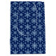 This beautiful and elegant gift bag has blue and white snowflakes on a dark blue background.
