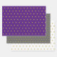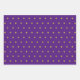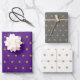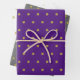 Set of wrapping paper in a classic pattern of yellow gold stars on a purple, grey and white background.