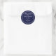 Classic Thank You Custom Names Navy Blue Wedding Classic Round Sticker. Thank You Stickers with both bride and groom names and date of your marriage personalised. Elegant classic simple fancy white script lettering on a navy blue background. All text is customisable quickly and easily to your own special details. Click image to personalise it. 30 Day Money Back Guarantee. Ships Worldwide fast.