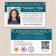 Express gratitude to clients with custom thank you business cards. A perfect way to show your appreciation and invite future collaborations. This editable template can be personalised with your profile photo, name, credentials, area served, contact details, and a personal thank-you message. Add your company logo or certification mark for branding, and easily direct clients to your review site via a scannable QR code to encourage This classic design has fully customisable text to fit your business brand and clientele. Perfect for a Notary Public, Loan Signing Agent, Certified Notary Trust Delivery Agent (CNTDA), Mobile Notary, Apostille Service or other legal profession. Printed colours: dark teal, white and gold colour. Shop the online collection for more popular product ideas and supplies designed for notaries!