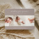 Elegant and classic birth announcement features three photos aligned side by side on a gender neutral greige taupe background. Personalize with baby's name, birth stats, and your family signature in crisp white lettering.