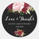 This classic tropical black love & thanks wedding classic round sticker is perfect for a rustic wedding. The artistic bordo marsala design features watercolor, green, pink, burgundy and blush roses assorted with greenery neatly arranged in a graceful and radiant flower bouquet.