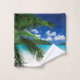 This remarkable photo has all the makings of a tropical paradise. From lush green palms, tropical islands, clear, fresh and shimmering tropical turquoise sea water, soft white sandy beaches on a bright, warm, and sunny day under a blue sky. I could imagine relaxing on this beach with a cold drink in hand, feeling a gentle warm breeze, hearing the splash of sea waves against the shore and letting all my worries fade away.
