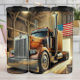 This image features a vintage-style, copper-toned semi-truck parked inside a rustic wooden barn. The truck has chrome accents and a classic design. In the background, an American flag hangs prominently, partially obscured by the barn's open doorway which lets in bright daylight. The scene evokes a sense of Americana and classic trucking heritage.