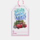 These beautiful Christmas gift tags showcase a vibrant red vintage truck adorned with a tree and holiday decorations, embodying the spirit of the season. The cheerful Merry and Bright Nights text adds a festive touch, perfect for gift-giving.