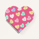 This cute heart notebook features a Valentine's Day theme. The background is a bright pink with classic Valentine heart candy. The colourful candies feature various sayings.