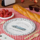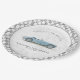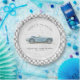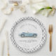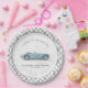 Rev up the celebration with these retro-chic baby shower paper plates! Featuring a soft slate blue watercolor convertible, chequered flag-inspired trim, and a subtle toile-style car pattern in the background, these plates bring a nostalgic charm to your “classic in the making” theme. Personalised with the shower date and name, they're the perfect stylish addition for serving cake, snacks, or just elevating the decor of your car-themed baby shower.