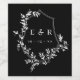 Elegant wedding wine labels with a white shield crest on a black background adorned with black leaves, with your monogram and wedding date in white in the centre.