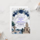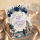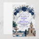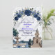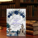This design features a sophisticated, painted illustration of a classical architecture estate and grand staircase in the distance, viewed through a lush arch of navy and dusty blue roses with soft green foliage. In the foreground, an ornamental stone fountain sits near a tranquil body of water graced by a pair of white swans. The background simulates a refined ivory and light gray faux marble texture to enhance the formal aesthetic. The typography combines handwritten calligraphy script for the names with a traditional serif font for the details. This is a flat printed image with a faux marble and watercolor effect, not actual raised stone or hand-painted material.