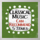 A funny typographic design that says "Classical Music: Can Recommend, 5 Stars". It's black and red text on a white rectangle with funky, playful white dots surrounding it, all on a green background.